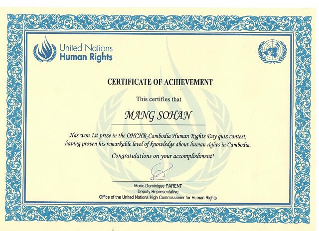 A Master student in International Human Rights Law sponsored by Raoul Wallengberge Institute (RWI) under PUC's law faculty, Mr. MANG SOHAN won the 1st Top Winner of Human Rights Day quiz Contest which was held from 7-10 December 2015, organized by the Office United Nations of High Commissioner for Human Rights.