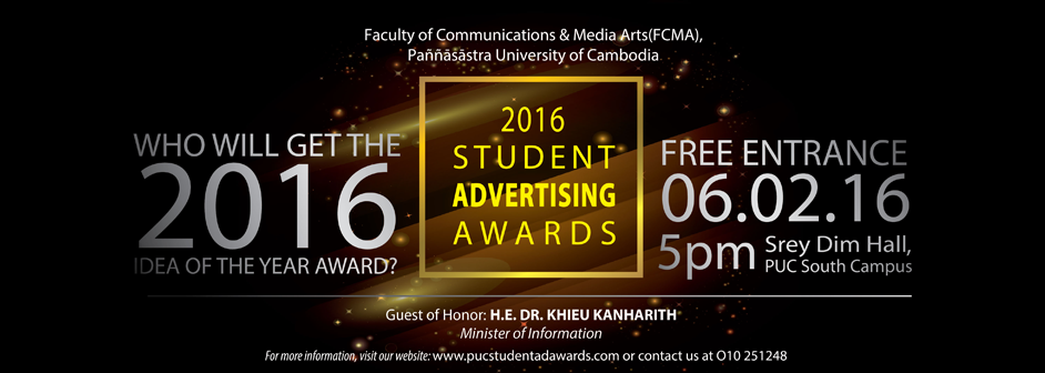 Twenty three creatively designed advertisements created and produced by 20 students of the Faculty of Communications and Media Arts (FCMA) of Paññāsāstra University of Cambodia (PUC) will compete for this year’s most creative advertising idea in the 2016 Student Advertising Awards on February 6, 2016, 5: 00 P.M at Srey Dim Conference Hall, PUC South Campus.