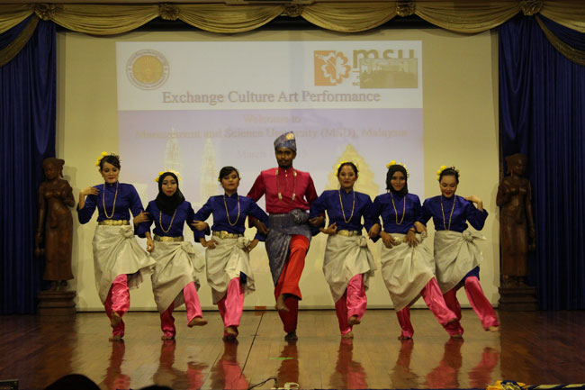 In colorful dress, stood many dancers of PUC students on the stage. A funny happy dance is performed which attracts hundreds of audiences in Srey Dim Hall. In reply, students from MSU presented their dance. It is an art of sharing and understanding. After the performing, MSU students toured around the university and half of them met with management team to present their university and discuss if there shall be a closer cooperation in the near future cooperation.