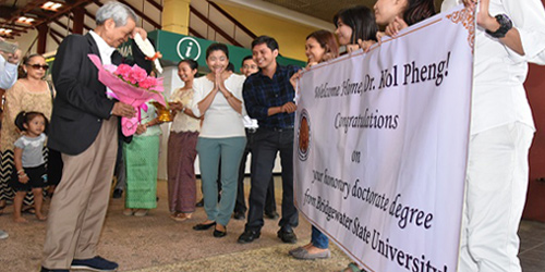 Hundreds of students stood at the entrance of PUC to welcome the arrival of Dr. Kol Pheng, founding father and president, after the conferment of his honorary doctorate in intercultural relations from Bridgewater State University in Massachusetts, USA.